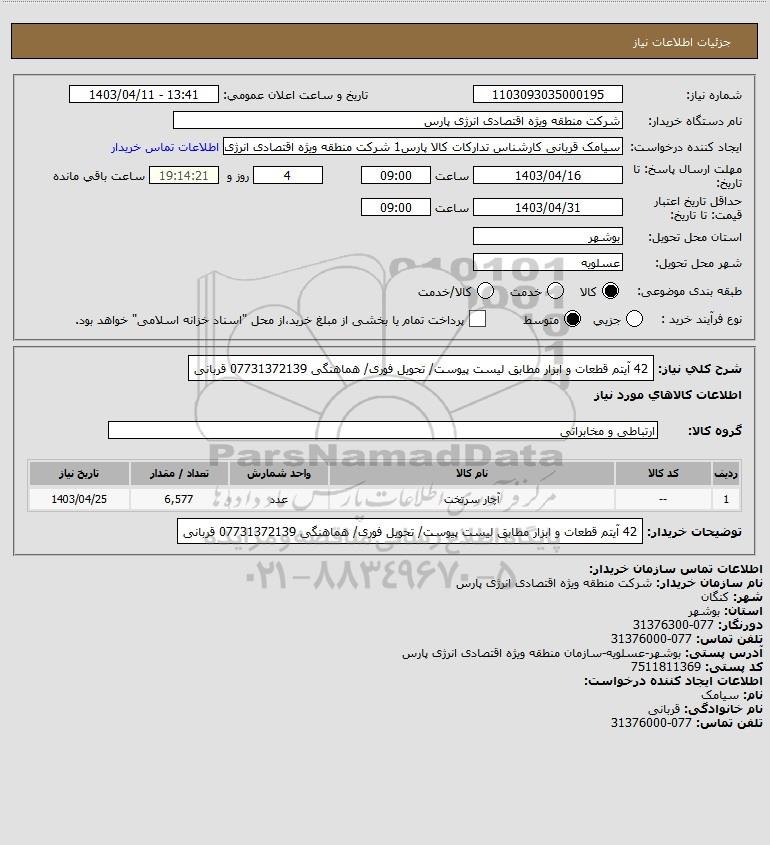 نام دستگاه خریدار:شرکت منطقه ویژه اقتصادی انرژی پارس