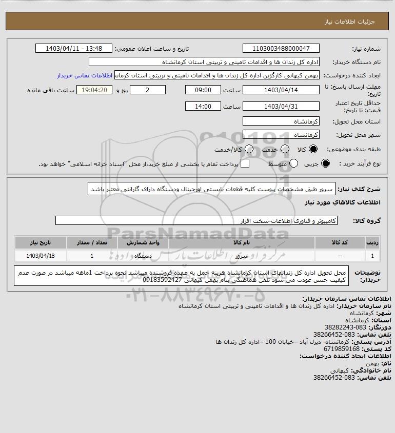 شرح کلی نیاز: سرور طبق مشخصات پیوست کلیه قطعات بایستی اورجینال ودستگاه دارای گارانتی معتبر باشد