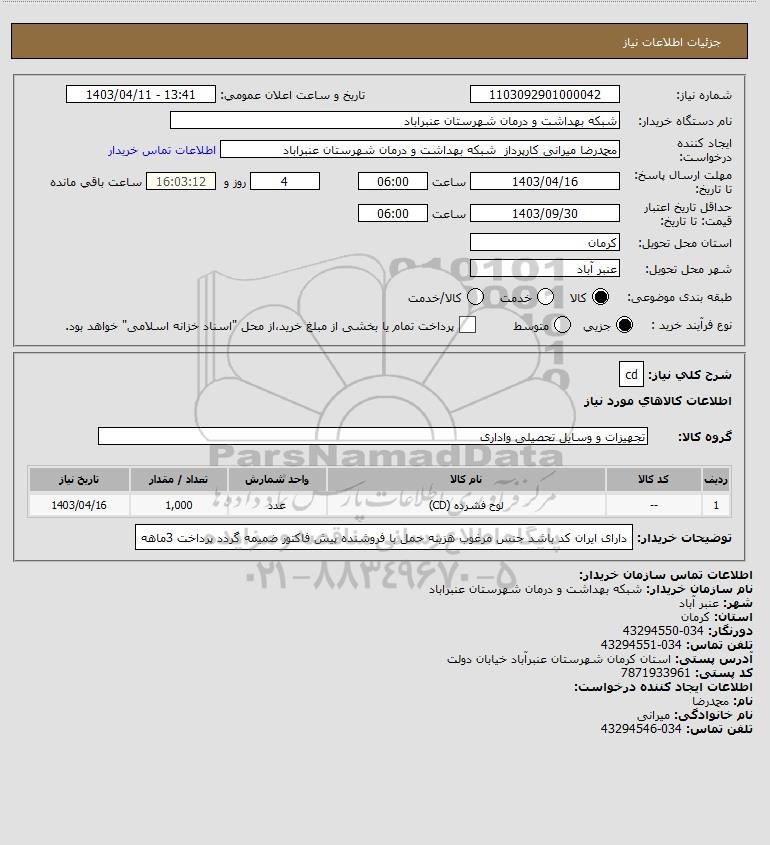 | 1 | -- | لوح فشرده (CD) | عدد | 1,000 | 1403/04/16 |