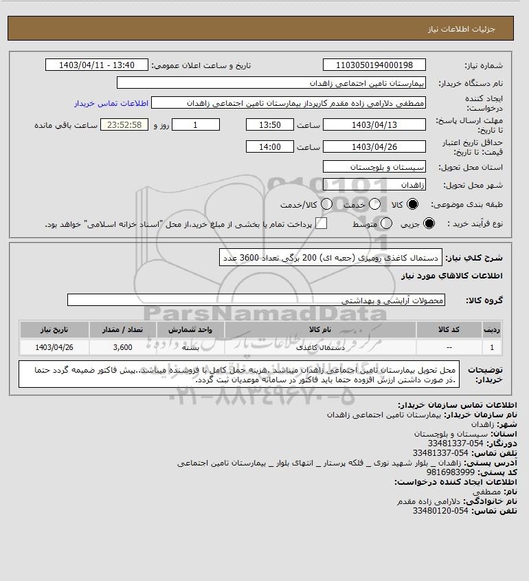 نام دستگاه خریدار:بیمارستان تامین اجتماعی زاهدان