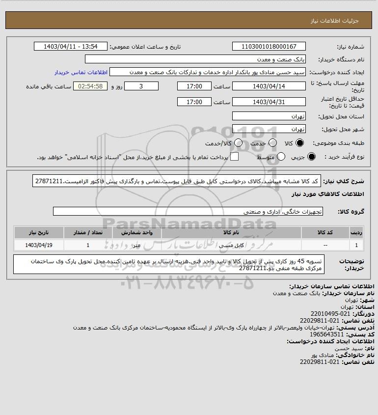 شرح کلی نیاز: کد کالا مشابه میباشد.کالای درخواستی کابل طبق فایل پیوست.تماس و بارگذاری پیش فاکتور الزامیست.27871211