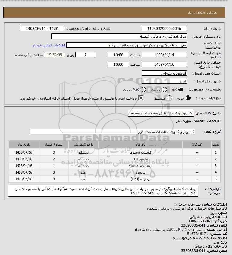شرح کلی نیاز: کامپیوتر و قطعات طبق مشخصات پیوستی