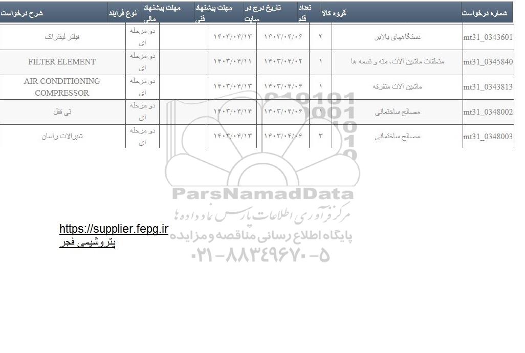 استعلام بها و موضوع استعلام استعلام FILTER ELEMENT به اطلاع کلیه شرکتها و افراد متخصص واجد شرایط میرساند، آگهی گذار در نظر دارد از طریق استعلام بها، نسبت به انتخاب و دریافت پیشنهادات اقدام نماید. این استعلام با کد آگهی ثبت شده در سامانه خبرگزاری پارس نماد : 7672617 منتشر شده است. مشخصات استعلام : تاریخ شروع استعلام: 1403/04/11 آخرین مهلت ارسال پیشنهاد قیمت : 1403/04/11 و محل اجرای پروژه : استان خوزستان میباشد. استعلام قیمت مورد درخواست : استعلام FILTER ELEMENT با دستهبندیهای تخصصی و گروه های مرتبط : انواع فیلتر های تصفیه, تجهیزات نفت و گاز, استعلام اطلاع رسانی میگردد.