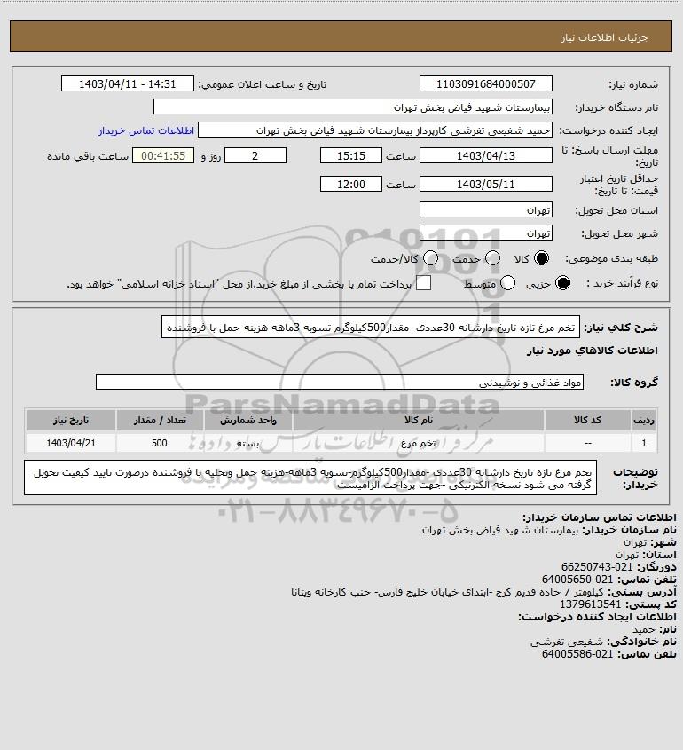 توضیحات خریدار:تخم مرغ تازه تاریخ دارشانه 30عددی -مقدار500کیلوگرم-تسویه 3ماهه-هزینه حمل وتخلیه با فروشنده درصورت تایید کیفیت تحویل گرفته می شود نسخه الکترنیکی -جهت پرداخت الزامیست