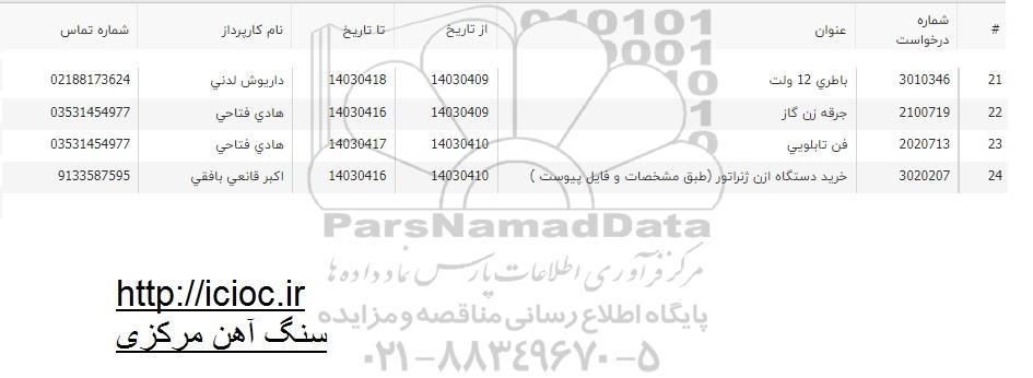 | 3020207 | خرید دستگاه ازن ژنراتور (طبق مشخصات و فایل پیوست) | 1403.4.16 | اکبر قانعی بافقی | 9133587595 |