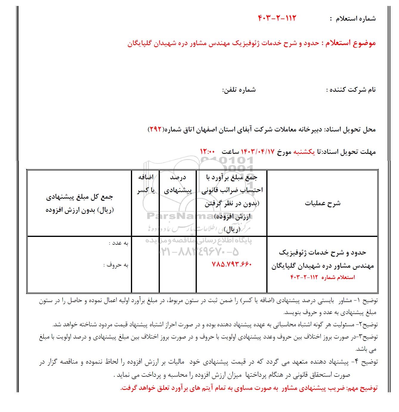 موضوع استعلام: حدود و شرح خدمات ژئوفیزیک مهندس مشاور دره شهید گلپایگان