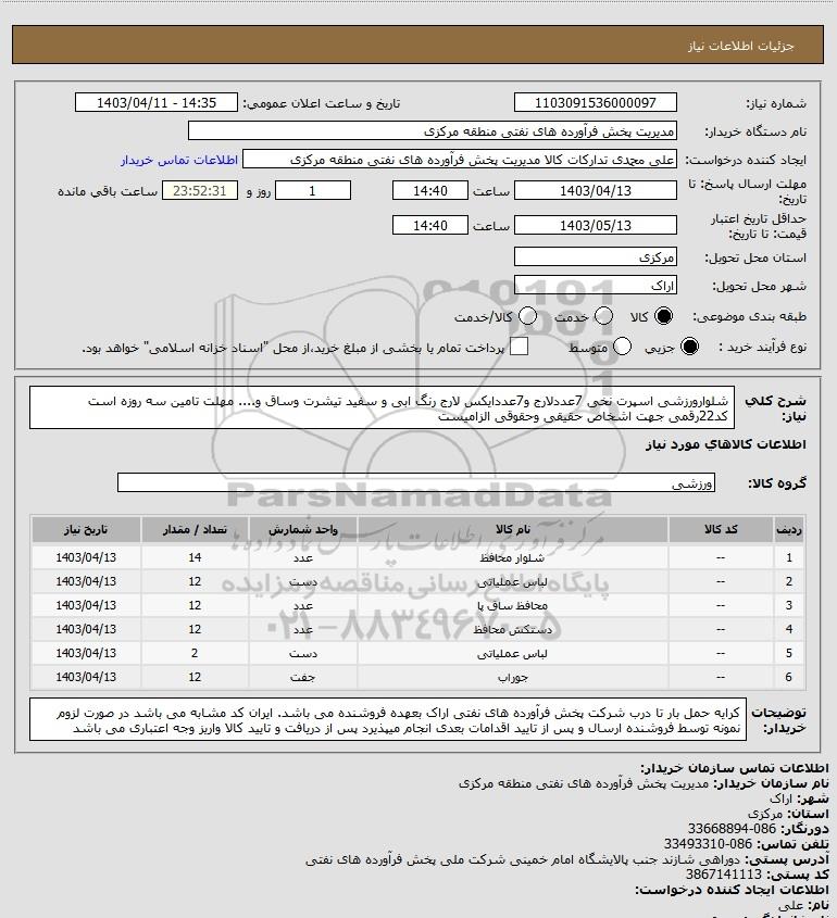 اسناد مناقصه استعلام شلوارورزشی اسپرت نخی 7عددلارج و7عددایکس لارج رنگ ابی و سفید تیشرت وساق و.... مهلت تامین سه روزه است کد22رقمی جهت اشخاص حقیقی وحقوقی الزامیست به علت اتمام مهلت شرکت در مناقصه از روی وب سایت برداشته شده است. برای رویت اسناد جدید به صفحه اسناد مناقصه مزایده مراجعه کنید.