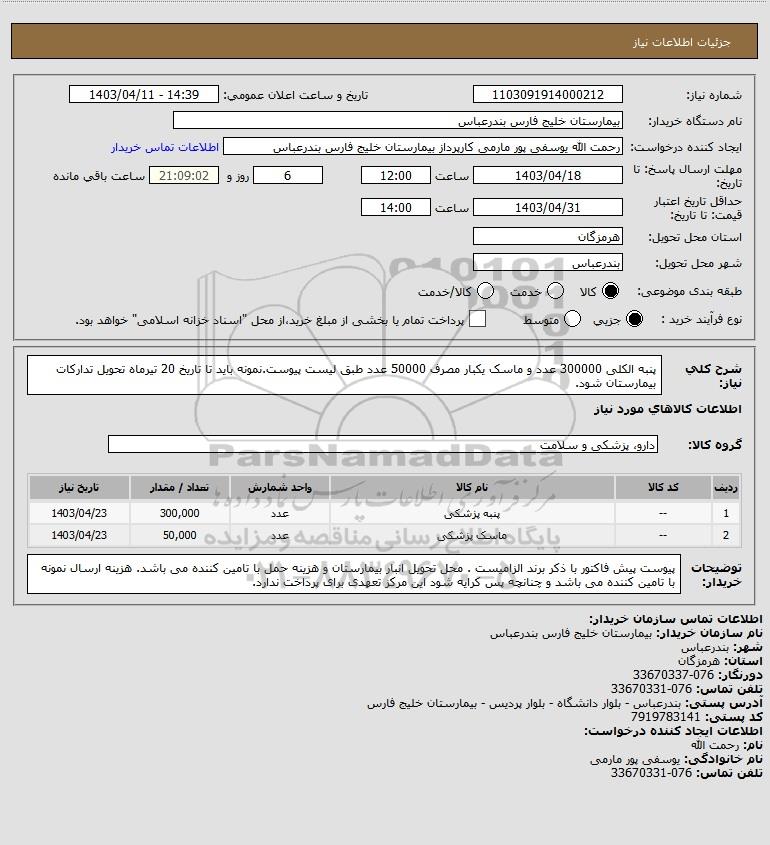 شرح کلی نیاز: پنبه الکلی 300000 عدد و ماسک یکبار مصرف 50000 عدد طبق لیست پیوست.نمونه باید تا تاریخ 20 تیرماه تحویل تدارکات بیمارستان شود.