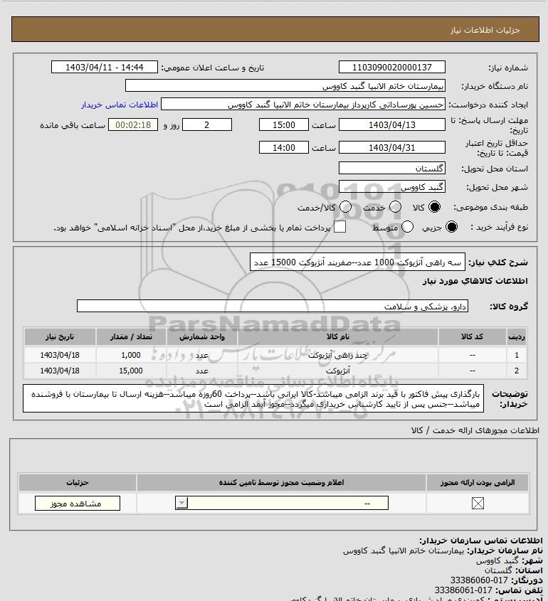 شرح کلی نیاز: سه راهی آنژیوکت 1000 عدد--صفربند آنژیوکت 15000 عدد