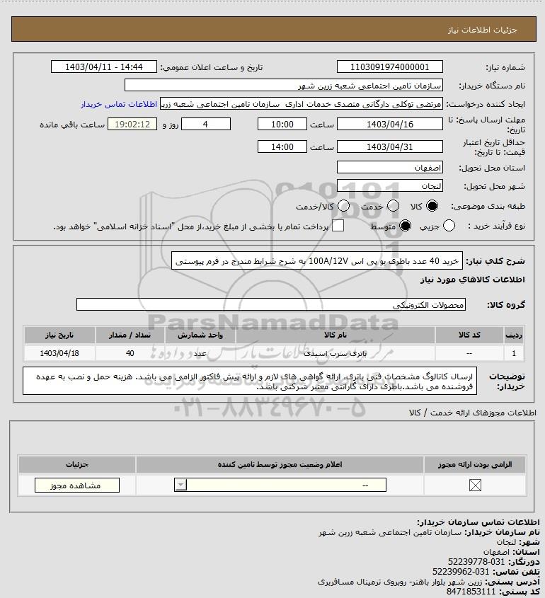 شرح کلی نیاز: خرید 40 عدد باطری یو پی اس 100A/12V به شرح شرایط مندرج در فرم پیوستی