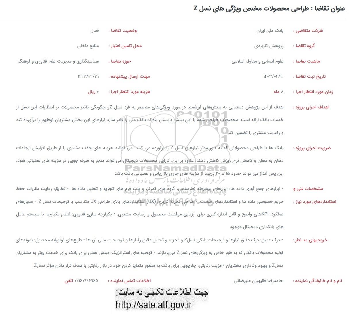 علاقهمندان میتوانند جهت دریافت اسناد و اطلاعات تکمیلی، فراخوان طراحی محصولات مختص ویژگی های نسل Z با سامانه مناقصات و مزایدات ایران پارسنماد داده ها 88349670 تماس حاصل نمایند.