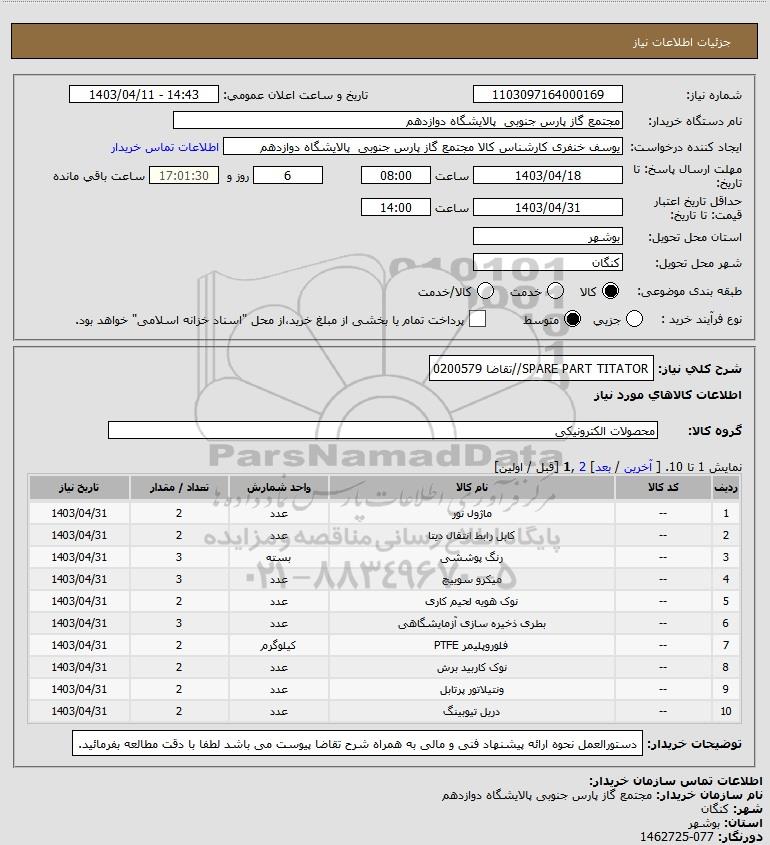 شرح کلی نیاز: SPARE PART TITATOR//تقاضا 0200579