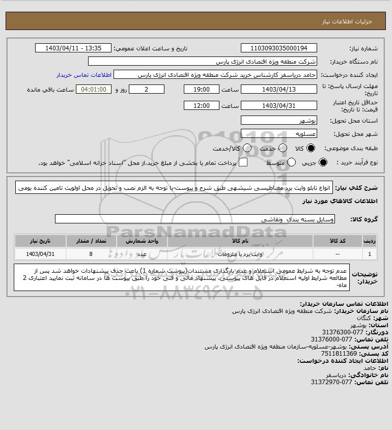 نام دستگاه خریدار:شرکت منطقه ویژه اقتصادی انرژی پارس