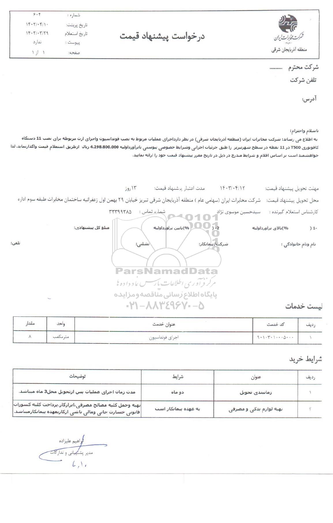 شرکت مخابرات ایران (منطقه آذربایجان شرقی) در نظر دارد اجرای عملیات مربوط به نصب فونداسیون و اجرای ارت مربوطه برای نصب 11 دستگاه کافو نوری  t500 در 11 نقطه در سطح استان را طبق جزئیات اجرایی و شرایط خصوصی پیوستی با براورد اولیه 4.290.000.000 ریال از طریق استعلام قیمت واگذار مناید