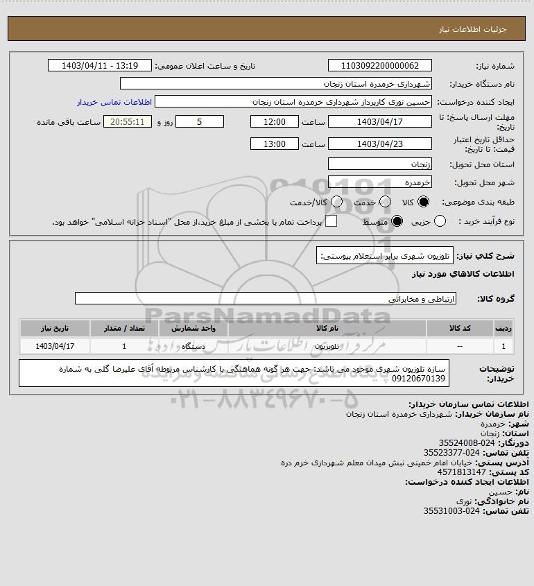 شرح کلی نیاز: تلوزیون شهری برابر استعلام پیوستی: