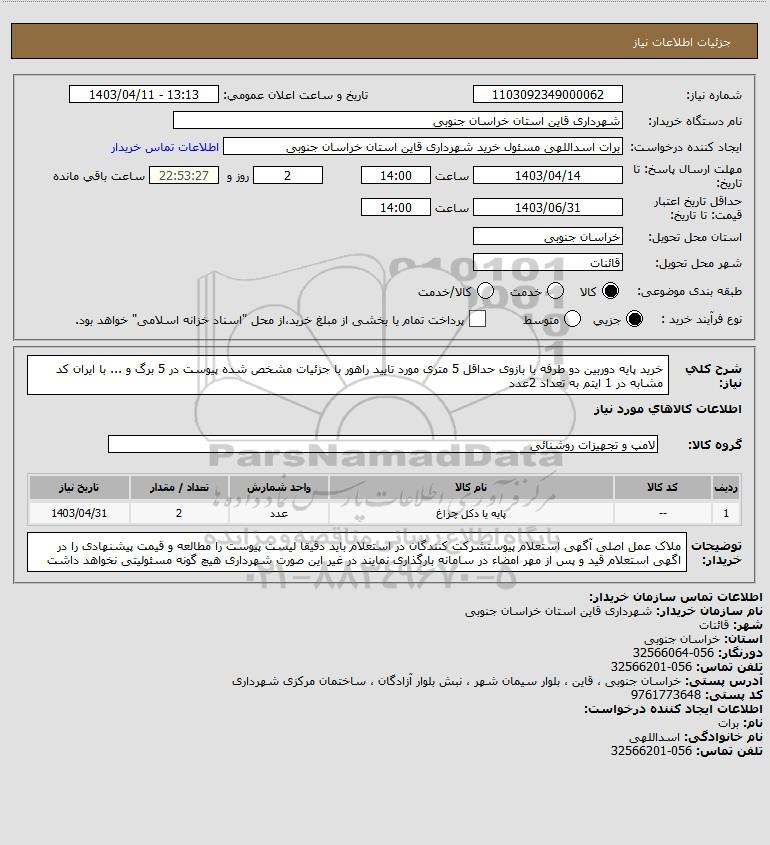 نام دستگاه خریدار:شهرداری قاین استان خراسان جنوبی
