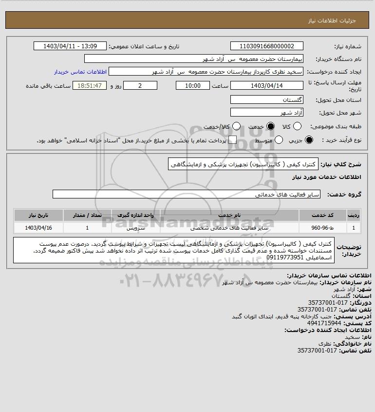 شرح کلی نیاز: کنترل کیفی ( کالیبراسیون) تجهیزات پزشکی و ازمایشگاهی