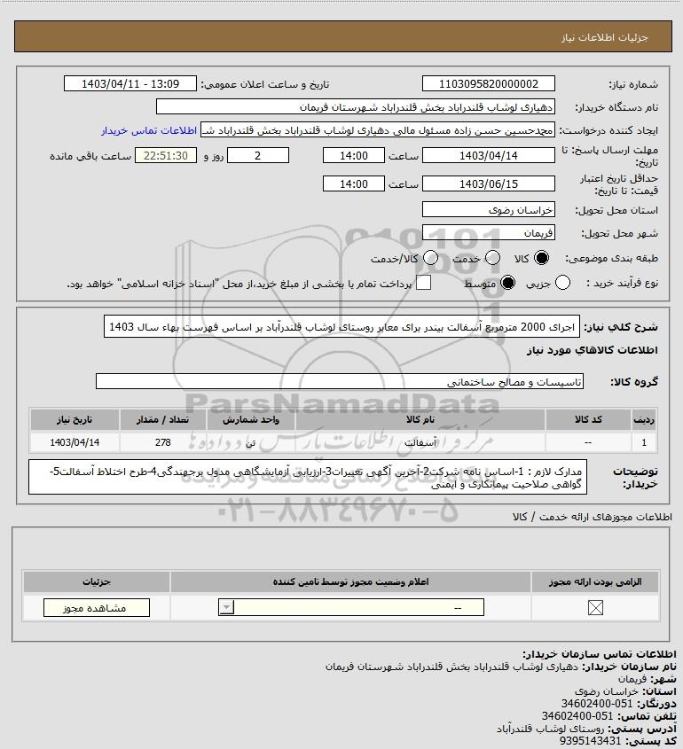 شرح کلی نیاز: اجرای 2000 مترمربع آسفالت بیندر برای معابر روستای لوشاب قلندرآباد بر اساس فهرست بهاء سال 1403