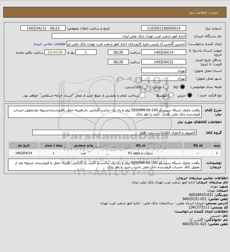 شرح کلی نیاز: یکعدد ماژول شبکه سیسکو 9200NM-4X-10G ریفر و ری پک نباشد.گارانتی دار.هزینه حمل بافروشنده.تسویه بعدتحویل.حساب فروشنده بانک ملی باشد. خرید با نظر بانک