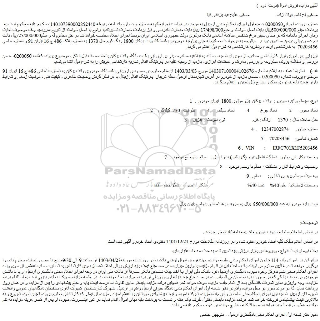 شماره پرونده اجرایی0200050 شعبه اول اجرای احکام مدنی اردبیل به موجب درخواست اجرایحکم به شماره و شماره دادنامه مربوطه 140107390002852440 محکوم علیه محکوم است به پرداخت مبلغ 500/000/000ریال بابت اصل خواسته و مبلغ17/498/000 ریال بابت خسارت دادرسی و نیز پرداخت خسارت تاخیرتادیه راجع به اصل خواسته از تاریخ سررسید چک موصوف لغایت زمان اجرای دادنامه که بر مبنای تغییر نرخ شاخص سالانه اعلامی بانک مرکزی دولت جمهوری اسلامی ایران توسط اجرای احکام محاسبه خواهد شد در حق محکوم له و مبلغ25/000/000 ریال بابت نیم عشردولتی درحق صندوق دولت.   ،باتوجه به درخواست محکوم له مبنی برتوقیف وفروش یکدستگاه وانت پیکان 1800 رنگ کرم مدل 1370 به شماره پلاک 486 ج 16 ایران 91 و شماره شاسی 70203456  به کارشناسی ارجاع ونظریه کارشناسی به شرح ذیل اعلام می گردد.