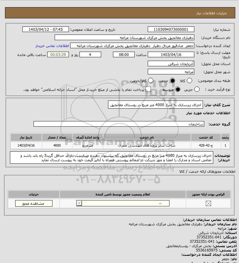 شرح کلی نیاز: اجرای زیرسازی به متراژ 4000 متر مربع در روستای مغانجیق