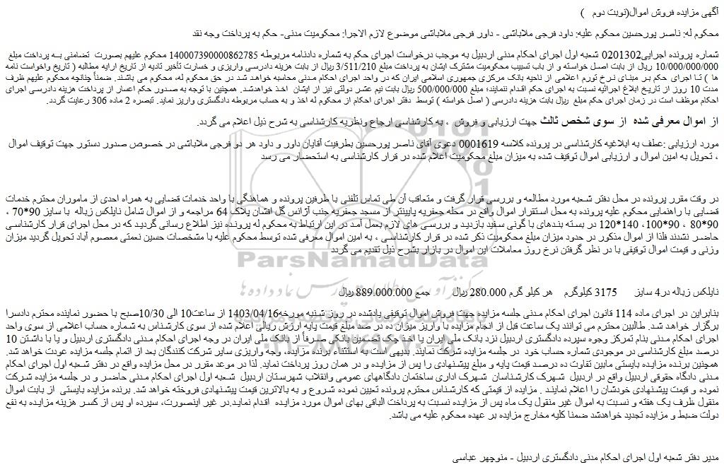 بنابراین در اجرای ماده 114 قانون اجرای احکام مدنی جلسه مزایده جهت فروش اموال توقیفی یادشده در روز شنبه مورخه1403/04/16 از ساعت10 الی 10/30صبح با حضور نماینده محترم دادسرا برگزار خواهد شد. طالبین محترم می توانند یک ساعت قبل از انجام مزایده با واریز میزان ده در صد مبلغ قیمت پایه ارزش ریالی اعلام شده از سوی کارشناس به شماره حساب اعلامی از سوی واحد اجرای احکام مدنی بنام تمرکز وجوه سپرده دادگستری اردبیل نزد بانک ملی ایران یا اخذ چک تضمین بانکی صرفاً از بانک ملی ایران در وجه اجرای احکام مدنی دادگستری اردبیل و یا با داشتن 10 درصد مبلغ کارشناسی در موجودی شماره حساب خود در جلسه مزایده شرکت نمایند. بدیهی است به استثناء برنده مزایده، وجه واریزی سایر شرکت کنندگان بعد از اتمام جلسه مزایده عودت خواهد شد. همچنین برنده مزایده بایستی مابین تفاوت ده درصد قیمت پایه و مبلغ پیشنهادی را پس از مزایده و در همان روز پرداخت نماید. لذا در موعد مقرر در محل مزایده واقع در دفتر شعبه اول اجرای احکام مدنی دادگاه حقوقی اردبیل واقع در اردبیل شهرک کارشناسان شهرک اداری ساختمان دادگاههای عمومی وانقلاب شهرستان اردبیل شعبه اول اجرای احکام مدنی حاضر و در جلسه مزایده شرکت نموده و قیمت پیشنهادی خودشان را اعلام نمایند . مزایده از قیمتی که کارشناس محترم پرونده تعیین نموده شروع و به بالاترین قیمت پیشنهادی فروخته خواهد شد. برنده مزایده بایستی از بابت اموال منقول ظرف یک هفته و نسبت به اموال غیر منقول یک ماه پس از مزایده نسبت به پرداخت الباقی بهای اموال مورد مزایده اقدام نماید.در غیر اینصورت، سپرده او پس از کسر هزینه مزایده به نفع دولت ضبط و مزایده تجدید خواهدشد ضمنا کلیه مخارج مزایده بر عهده محکوم علیه می باشد.