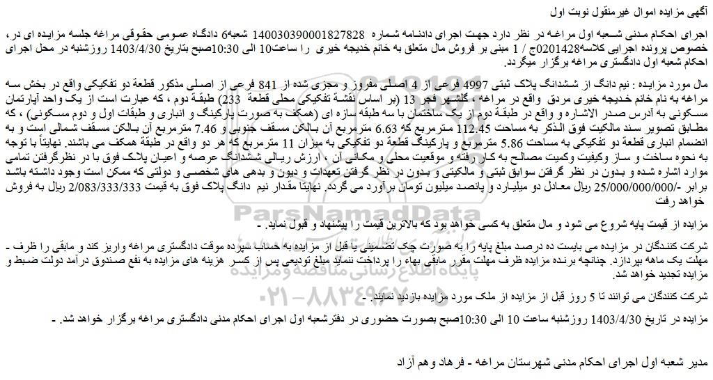 - مزایده در تاریخ 1403/4/30 روزشنبه ساعت 10 الی 10:30صبح بصورت حضوری در دفترشعبه اول اجرای احکام مدنی دادگستری مراغه برگزار خواهد شد.