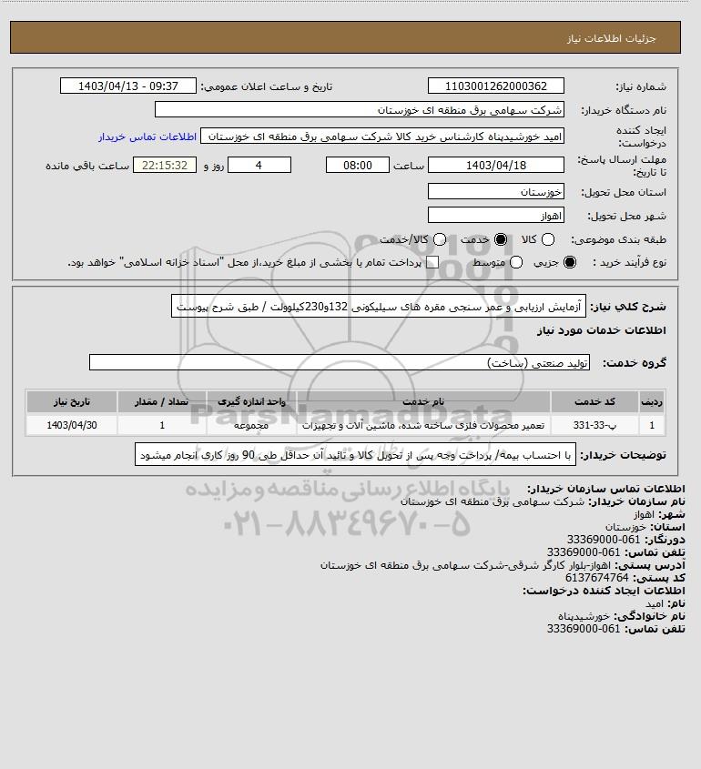شرح کلی نیاز: آزمایش ارزیابی و عمر سنجی مقره های سیلیکونی 132و230کیلوولت / طبق شرح پیوست