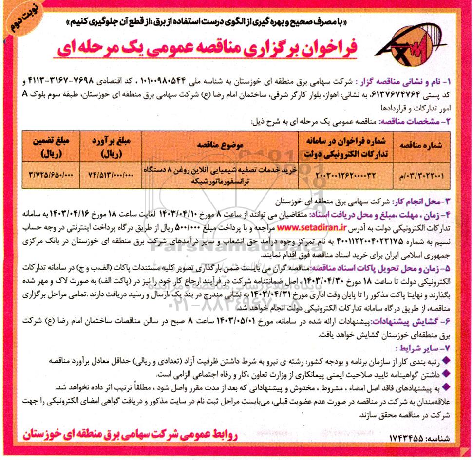 | 03/3022001/ م | 2003001262000032 | خرید خدمات تصفیه شیمیایی آنلاین روغن 8 دستگاه ترانسفورماتور شبکه | 74.513.000.000 | 3.725.650.000 |