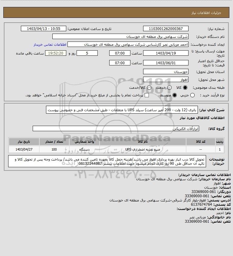 شرح کلی نیاز: باتری (12 ولت - 200 آمپر ساعت) سیلد UPS با متعلقات - طبق مشخصات فنی و خصوصی پیوست