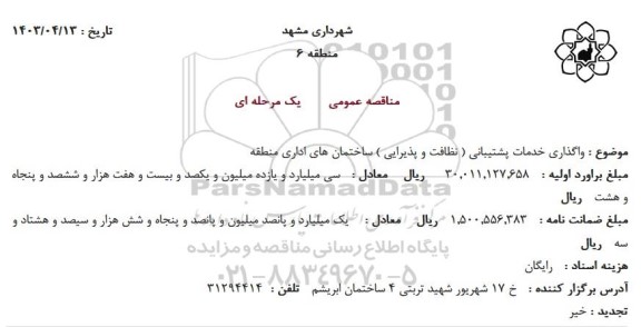 علاقهمندان میتوانند جهت دریافت اسناد و اطلاعات تکمیلی، مناقصه واگذاری خدمات پشتیبانی ( نظافت و پذیرایی ) ساختمان های اداری با سامانه مناقصات و مزایدات ایران پارسنماد داده ها 88349670 تماس حاصل نمایند.