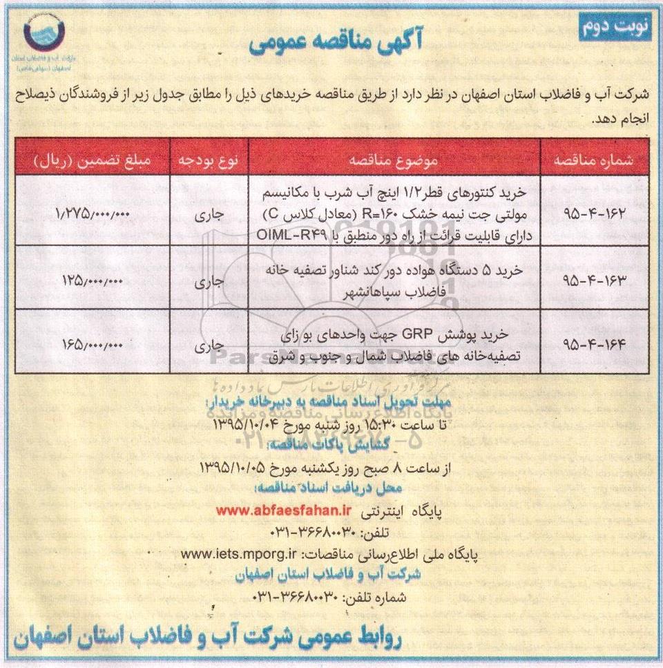 شرکت آب و فاضلاب استان اصفهان در نظر دارد از طریق مناقصه خریدهای ذیل را مطابق جدول زیر از فروشندگان ذیصلاح انجام دهد.
