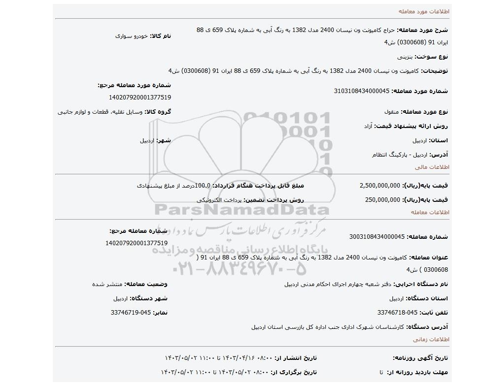 عنوان معامله: کامیونت ون نیسان 2400 مدل 1382 به رنگ آبی به شماره پلاک 659 ی 88 ایران 91 ( 0300608 ) ش4 | ||