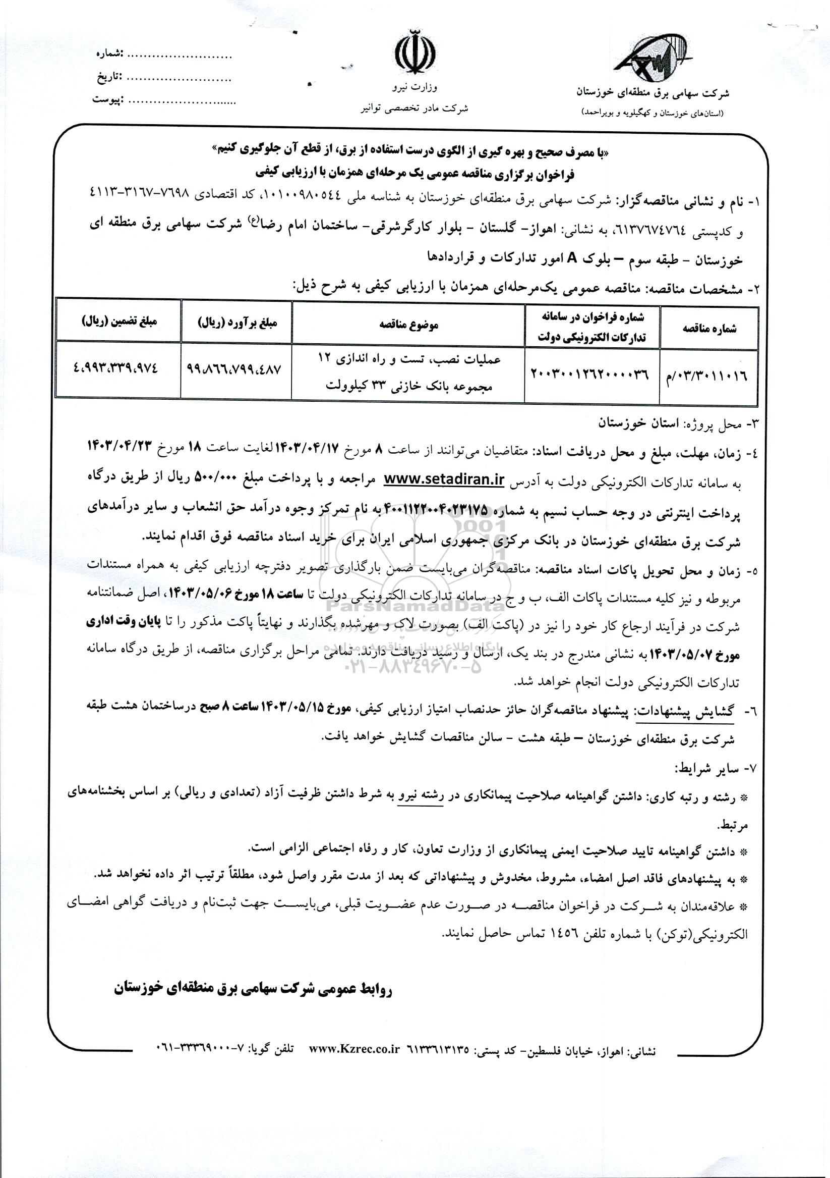 1- نام و نشانی مناقصه گزار: شرکت سهامی برق منطقه ای خوزستان به شناسه ملی 10100980544 کد اقتصادی 7698 - 3167 - 4113 و کد پستی 6137674764 به نشانی: اهواز - بلوار کارگر شرقی - ساختمان امام رضا (ع) شرکت سهامی برق منطقه ای خوزستان - طبقه سوم - بلوک A امور تدارکات و قراردادها