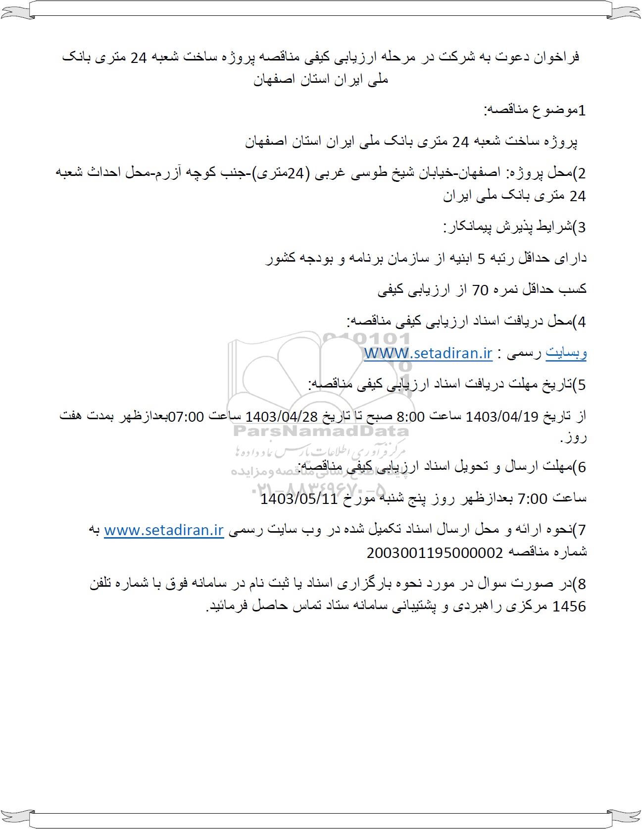 فراخوان دعوت به شرکت در مرحله ارزیابی کیفی مناقصه پروژه ساخت شعبه 24 متری بانک ملی ایران استان اصفهان