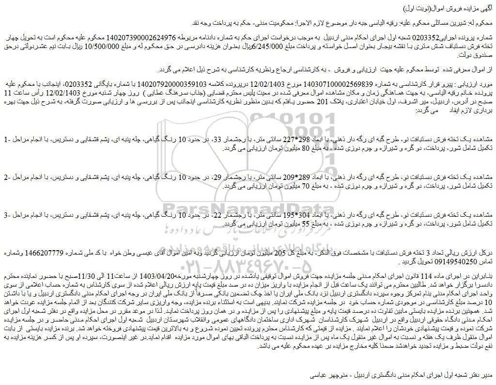 شماره پرونده اجرایی0203352 شعبه اول اجرای احکام مدنی اردبیل  به موجب درخواست اجرای حکم به شماره دادنامه مربوطه 140207390002624976 محکوم علیه محکوم است به تحویل چهار تخته فرش دستباف شش متری با نقشه بیجار بعنوان اصل خواسته و پرداخت مبلغ 6/245/000ریال بعنوان هزینه دادرسی در حق محکوم له و مبلغ 10/500/000 ریال بابت نیم عشردولتی درحق صندوق دولت.