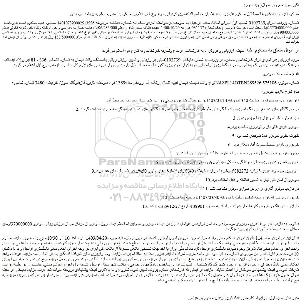 4 مزایده ششدانگ یک دستگاه اتومبیل سواری تیپ آردی 9807624 1404/08/14 new not special not payed آذربایجان شرقی