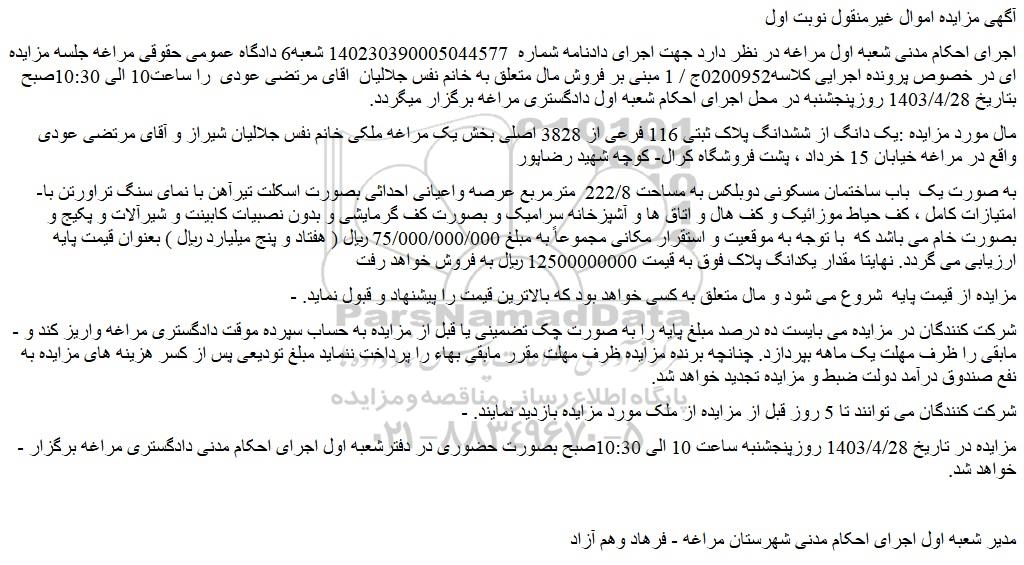 - مزایده در تاریخ 1403/4/28 روزپنجشنبه ساعت 10 الی 10:30صبح بصورت حضوری در دفترشعبه اول اجرای احکام مدنی دادگستری مراغه برگزار خواهد شد.