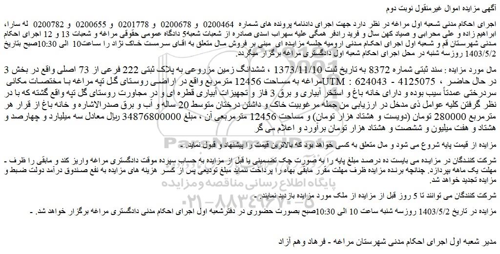 - مزایده در تاریخ 1403/5/2 روزسه شنبه ساعت 10 الی 10:30صبح بصورت حضوری در دفترشعبه اول اجرای احکام مدنی دادگستری مراغه برگزار خواهد شد.