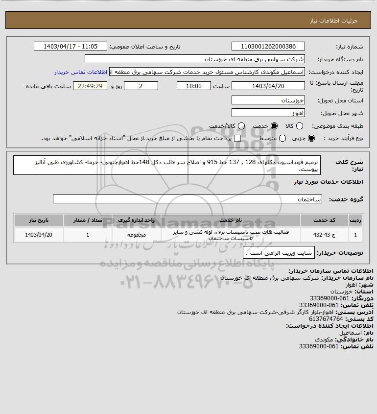 استعلام ترمیم فونداسیون دکلهای 128 137 خط 915 و اصلاح سر قالب دکل 148خط اهوازجنوبی- خرما- کشاورزی طبق آنالیز پیوست., استعلام ترمیم فونداسیون دکلهای 128 , 137 خط 915 و اصلاح سر قالب دکل 148خط اهوازجنوبی- خرما- کشاورزی طبق آنالیز پیوست.