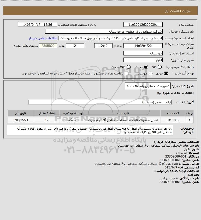 شرح کلی نیاز: تعمیر صفحه مانیتور رله های ABB