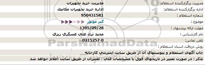 استعلام بها و موضوع استعلام استعلام , استعلام گیر موتور - 95.9.25 به اطلاع کلیه شرکتها و افراد متخصص واجد شرایط میرساند، آگهی گذار در نظر دارد از طریق استعلام بها، نسبت به انتخاب و دریافت پیشنهادات اقدام نماید. این استعلام با کد آگهی ثبت شده در سامانه خبرگزاری پارس نماد : 770152 منتشر شده است. مشخصات استعلام : تاریخ شروع استعلام: 1395/09/25 آخرین مهلت ارسال پیشنهاد قیمت : 1395/09/28 و محل اجرای پروژه : استان اصفهان میباشد. استعلام قیمت مورد درخواست : استعلام , استعلام گیر موتور - 95.9.25 با دستهبندیهای تخصصی و گروه های مرتبط : تجهیزات و ماشین آلات صنعتی, استعلام اطلاع رسانی میگردد.