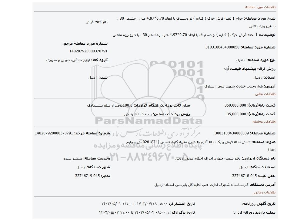 نام دستگاه اجرایی: دفتر شعبه چهارم اجرای احکام مدنی اردبیلوضعیت معامله: منتشر شده