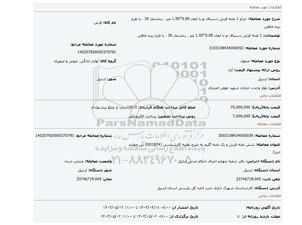 نام دستگاه اجرایی: دفتر شعبه چهارم اجرای احکام مدنی اردبیلوضعیت معامله: منتشر شده