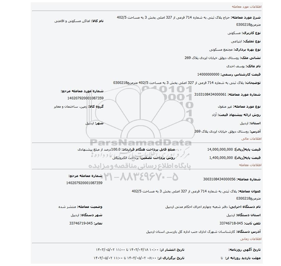 شرح مورد معامله: حراج پلاک ثبتی به شماره 714 فرعی از 327 اصلی بخش 3 به مساحت 402/5 مترمربع0300218نام کالا: اماکن مسکونی و اقامتی
