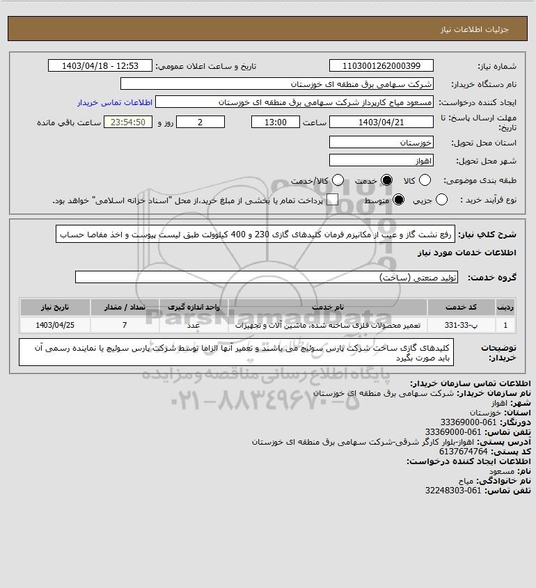 شرح کلی نیاز: رفع نشت گاز و عیب از مکانیزم فرمان کلیدهای گازی 230 و 400 کیلوولت طبق لیست پیوست و اخذ مفاصا حساب