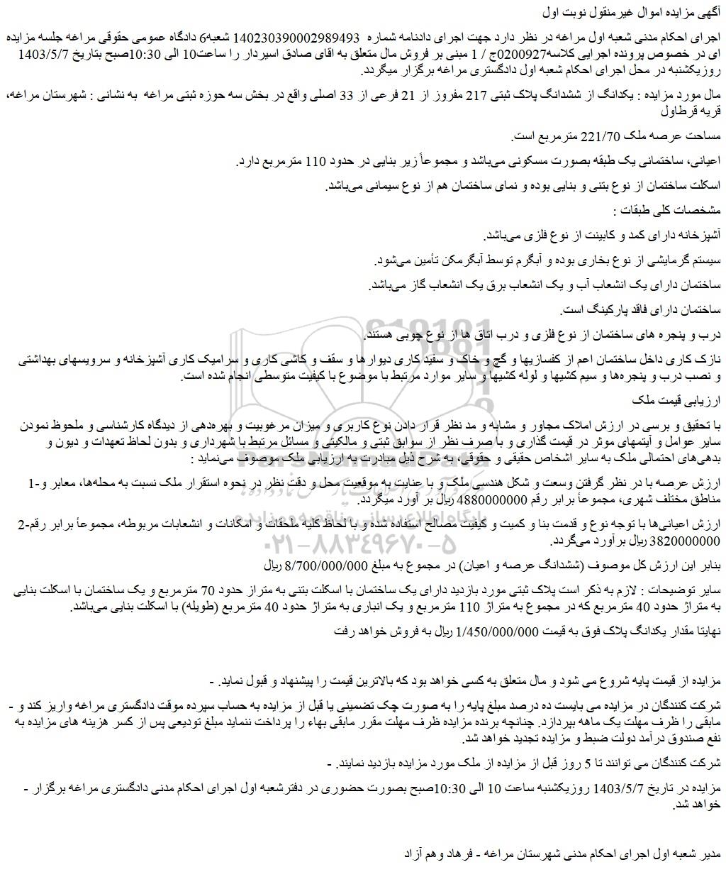 - مزایده در تاریخ 1403/5/7 روزیکشنبه ساعت 10 الی 10:30صبح بصورت حضوری در دفترشعبه اول اجرای احکام مدنی دادگستری مراغه برگزار خواهد شد.