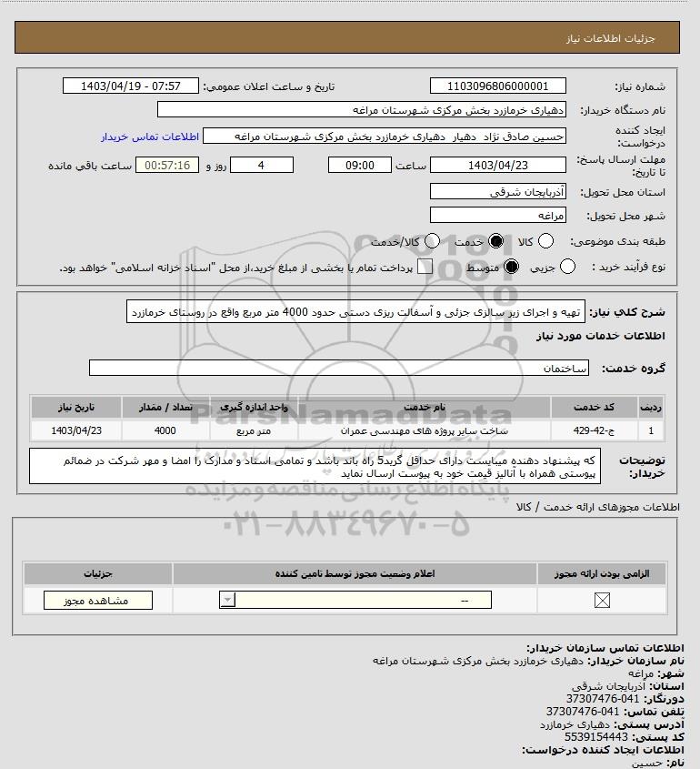 شرح کلی نیاز: تهیه و اجرای زیر سالزی جزئی و آسفالت ریزی دستی حدود 4000 متر مربع واقع در روستای خرمازرد