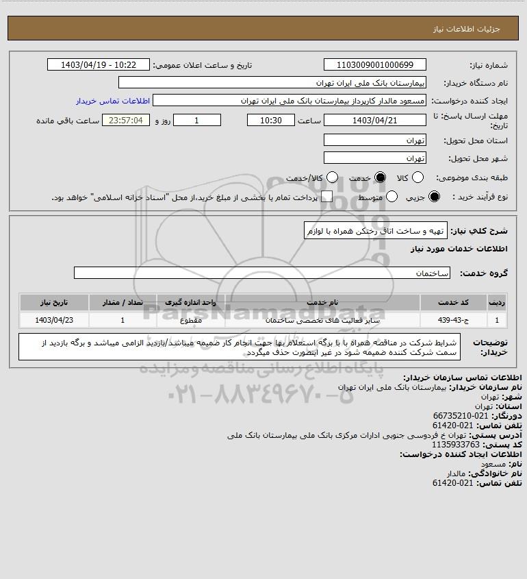 استعلام بها و موضوع استعلام استعلام تهیه و ساخت اتاق رختکن همراه با لوازم به اطلاع کلیه شرکتها و افراد متخصص واجد شرایط میرساند، آگهی گذار در نظر دارد از طریق استعلام بها، نسبت به انتخاب و دریافت پیشنهادات اقدام نماید. این استعلام با کد آگهی ثبت شده در سامانه خبرگزاری پارس نماد : 7708609 منتشر شده است. مشخصات استعلام : تاریخ شروع استعلام: 1403/04/19 آخرین مهلت ارسال پیشنهاد قیمت : 1403/04/21 و محل اجرای پروژه : استان تهران میباشد. استعلام قیمت مورد درخواست : استعلام تهیه و ساخت اتاق رختکن همراه با لوازم با دستهبندیهای تخصصی و گروه های مرتبط : ساختمان, استعلام اطلاع رسانی میگردد.