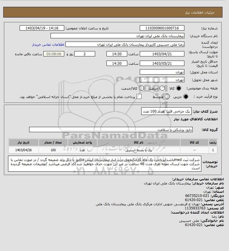 | 1 | -- | پک یا بسته استریل | عدد | 100 | 1403/04/26 |